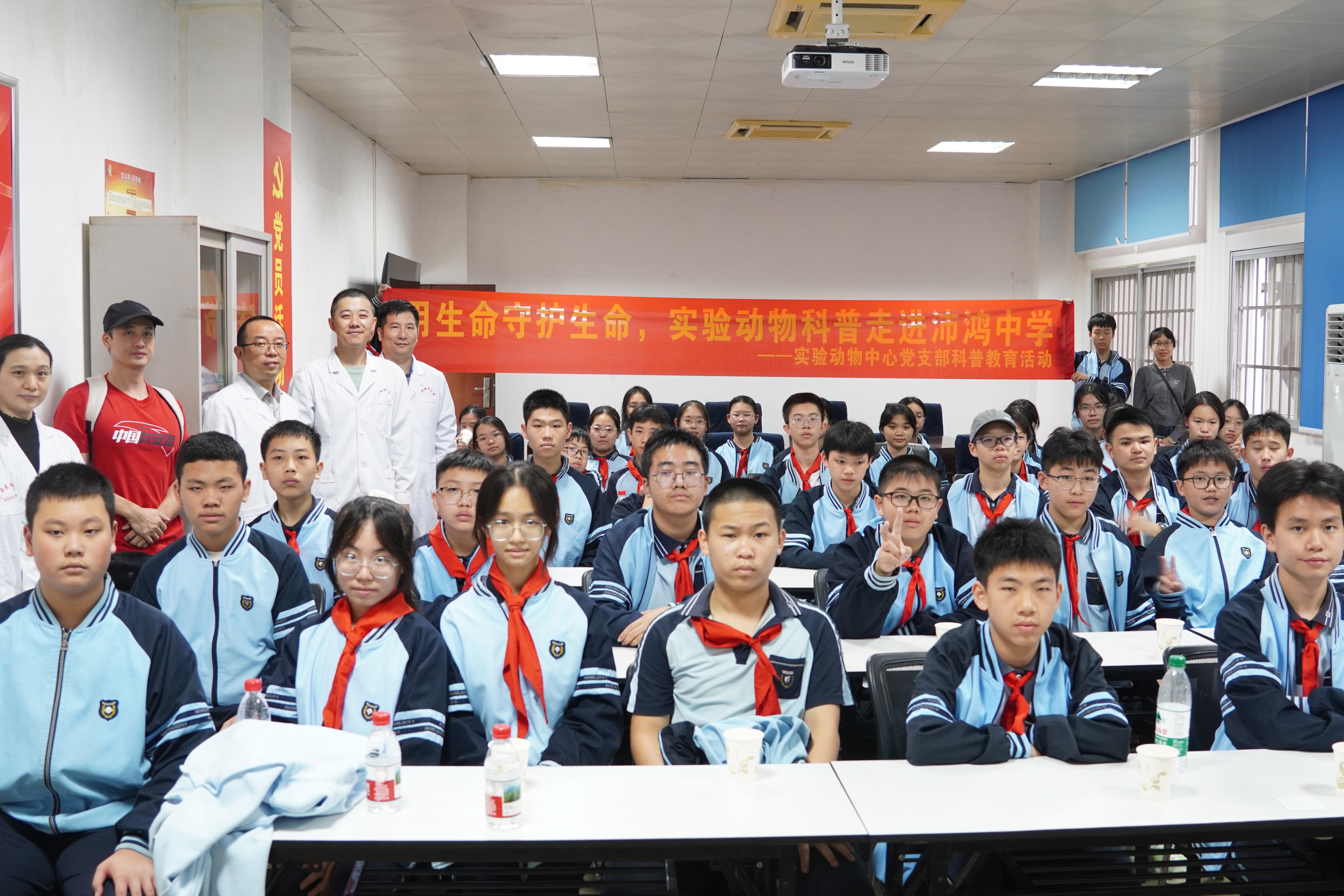 为积极响应全国科普日“创新引领,科普惠民”的号召,进一步拓展青少年科普知识面,12月12日下午,实验动物中心党支部携手南宁沛鸿民族中学,精心策划并开展了以“用生命守护生命,实验动物科普走进沛鸿中学”为主题的科普教育活动。实验动物中心欧阳轶强副主任、党支部张俊书记等教职工代表,以及南宁沛鸿民族中学初二年级师生、家长代表等共60人齐聚一堂,共同参与了这场别开生面的科普盛宴。