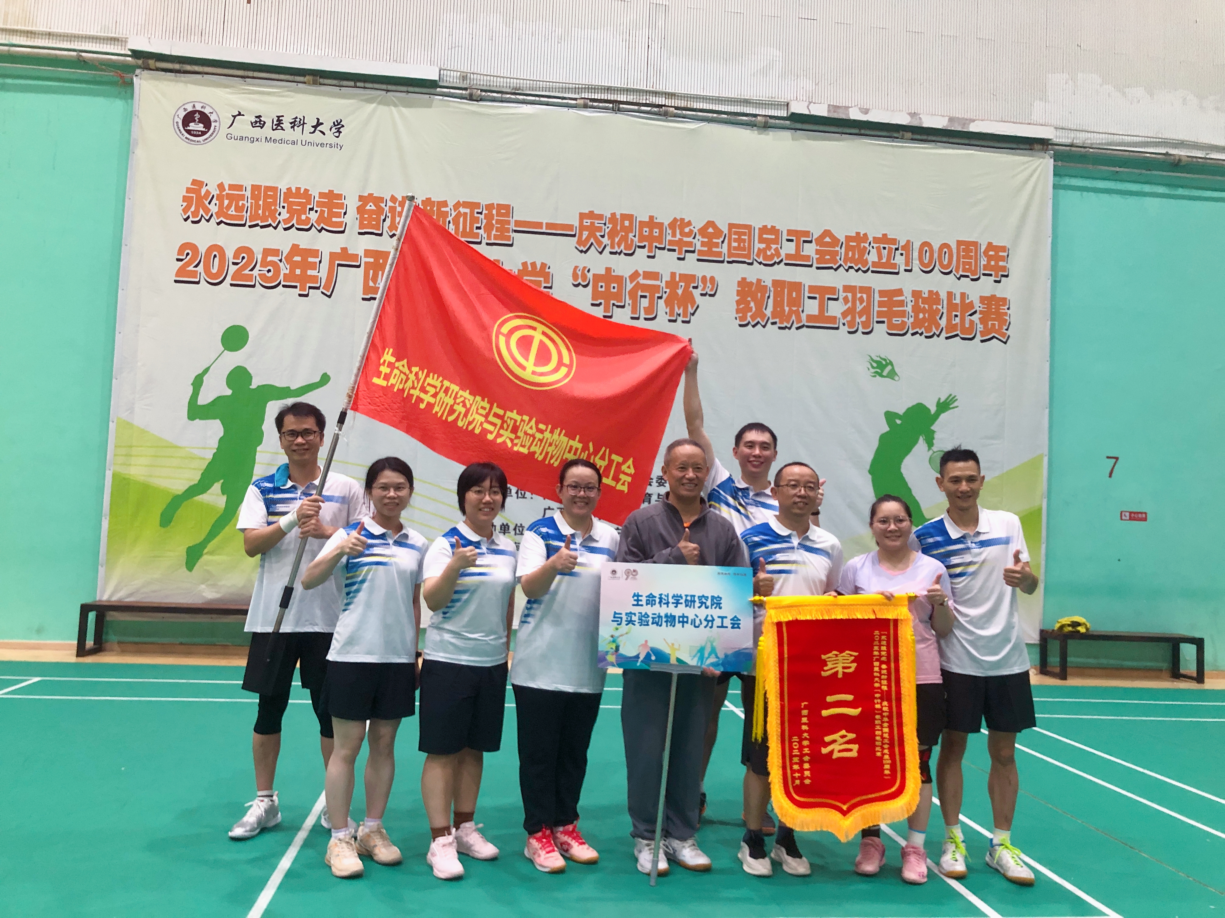 2025年10月25日,学校工会在风雨球馆举办2025年广西医科大学“中行杯”教职工羽毛球比赛。生命科学研究院与实验动物中心分工会代表队凭借出色的表现和顽强的拼搏精神,一路过关斩将,最终荣获团体亚军,展现了分工会职工团结奋进、昂扬向上的风采。